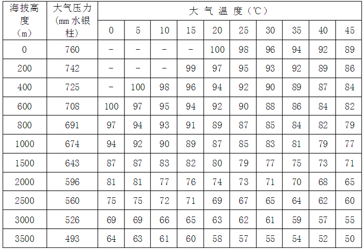2、如果外界氣壓、氣溫、濕度等上述標(biāo)準(zhǔn)情況下,則應(yīng)按下列附表中所列的修正系數(shù)加以修正,即實(shí)際功率應(yīng)等于標(biāo)準(zhǔn)乘以修正系數(shù)c。下列兩表分別為50%及100%相對濕度下各種氣、氣溫情況的修正系數(shù)c如溫度為其他數(shù)值時,可利用插入法根據(jù)此二表計(jì)算出相應(yīng)的修正系數(shù)。